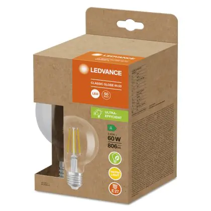 La Ledvance Globe LED E27 Filamento Chiara 3.8W 806lm - 830 Luce Calda | Sostitua 60W è la perfetta sostituzione per la tua lampada convenzionale 60W con attacco E27 grazie alla sua tecnologia LED. Passare a LED ti offrirà tanti vantaggi!
