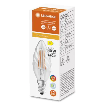 Risparmierai fino al 90% sui costi energetici e di mantenimento, grazie al basso consumo di energia assorbita dai 3.4W e ad una vita media utile di 15000 ore. A confronto: le lampade ad incandescenza tradizionali durano solamente 1000 ore. L’installazione delle lampadine LED è molto semplice: basta svitare le vecchia lampadina E14 a freddo ed avvitare la nuova lampada Ledvance Candela attorcigliata. Questo prodotto possiede la garanzia di qualità offerta da Ledvance e prezzi accessibili che partono da . Potrai utilizzare queste lampade usufruendo della Garanzia Totale Lampadadiretta.it di 4 anni.