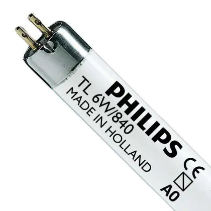 Le Philips TL Mini 80 Colours sono tubi fluorescenti con un diametro di 16 mm. Questi tubi sono molti piccoli e sottili. Le lampade sono pensate specificamente per aree in cui lo spazio é limitato, come illuminazione d'emergenza, mobili, ecc. Le Philips TL Mini Super 80 6W 840 - 21cm hanno una base di tipo G5 e misurano 21 cm.