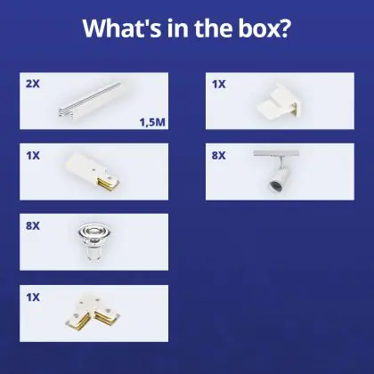 Descrizione Set completo 1-Fase Rail L 1,5 x 1,5 Metro Bianca | incl. 8x Faretti + GU10 2700K 3W Dimmerabile + Tappo Di Chiusura, Connettore di Alimentazione e L -Connettore